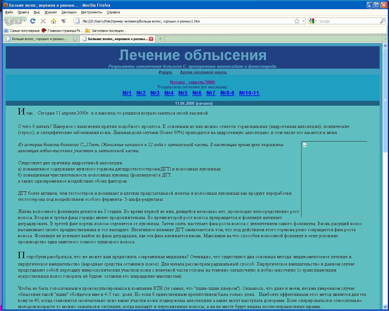 в те времена я наткнулся на сайт чувака "С" на Народ.ру, который подробно расписал с картинками как ему помог фин и мин, привел сравнения формул проскара и пропеции. это был первый не рекламный сайт с потрясным результатом, который меня крайне впечатлил. почти на след. день я поехал по московским аптекам выискивать проскар и регейн - тогда это была большая редкость. сайт сохранил у себя на компе, вот его 1я страница - может на него еще кто натыкался:
