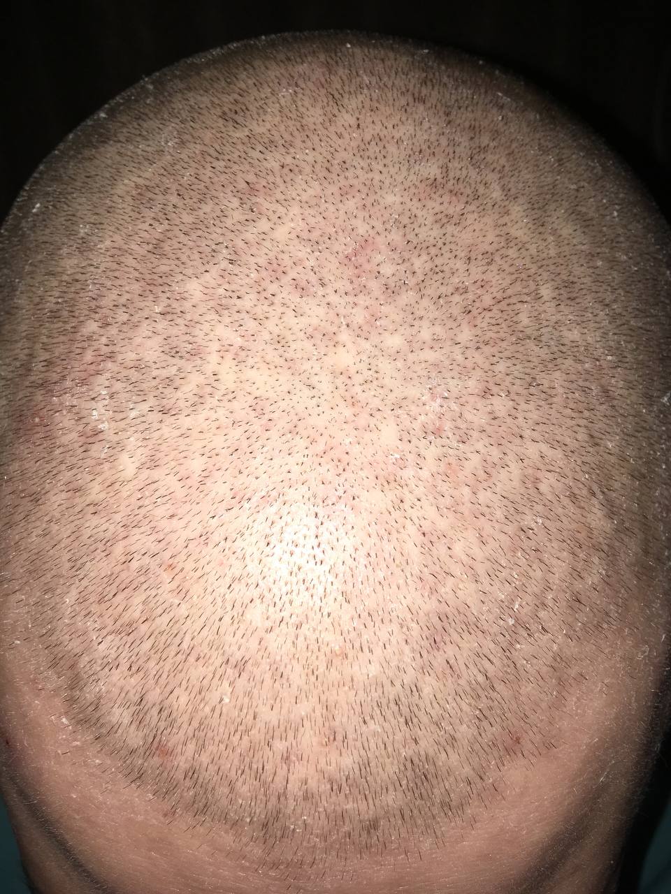 Привет. Примерно год капаю минокс (полгода кирка, потом генеролон), в последние месяцы стал забывать про это и примерно два месяца назад началось жуткое выпадение. Не нашёл ничего лучше как побриться под 1 мм (первый раз в жизни) и... обнаружил что мой волосяной покров не очень похож на то, что характерно при андрогенной алопеции (надо сходить к трихологу). Но кожа головы жирная. На фото думаю видны покраснения и незначительные воспаления. Кстати, вместе с миноксом почти прекратил мыть голову Кето Плюс, с ним ситуация получше была. Вопрос в общем такой: похоже ли это на начальную стадию облысения? Отмечу, что в сравнении со старыми фото, линия роста к 17-18 годам стала небольшой подковой, сначала дико бесило, но сейчас думаю, что это может быть возрастное изменение линии роста (читал где-то давно). В целом больше никаких изменений за 5 лет отметить не могу. Начинал юзать миноксидил, потому что был уверен что у меня АГА, сейчас появились сомнения.