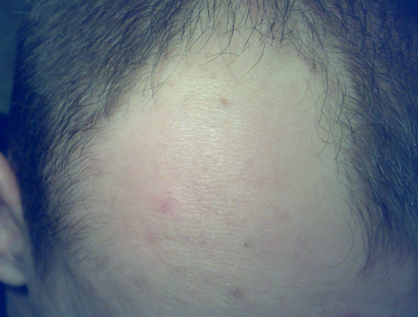 , вся залысина - сплошная вторая/третья зона, мелкие волоски начали лезть даже на лбу, по направлению от залысины к брови (до этого было немного на участке между бровью и виском).